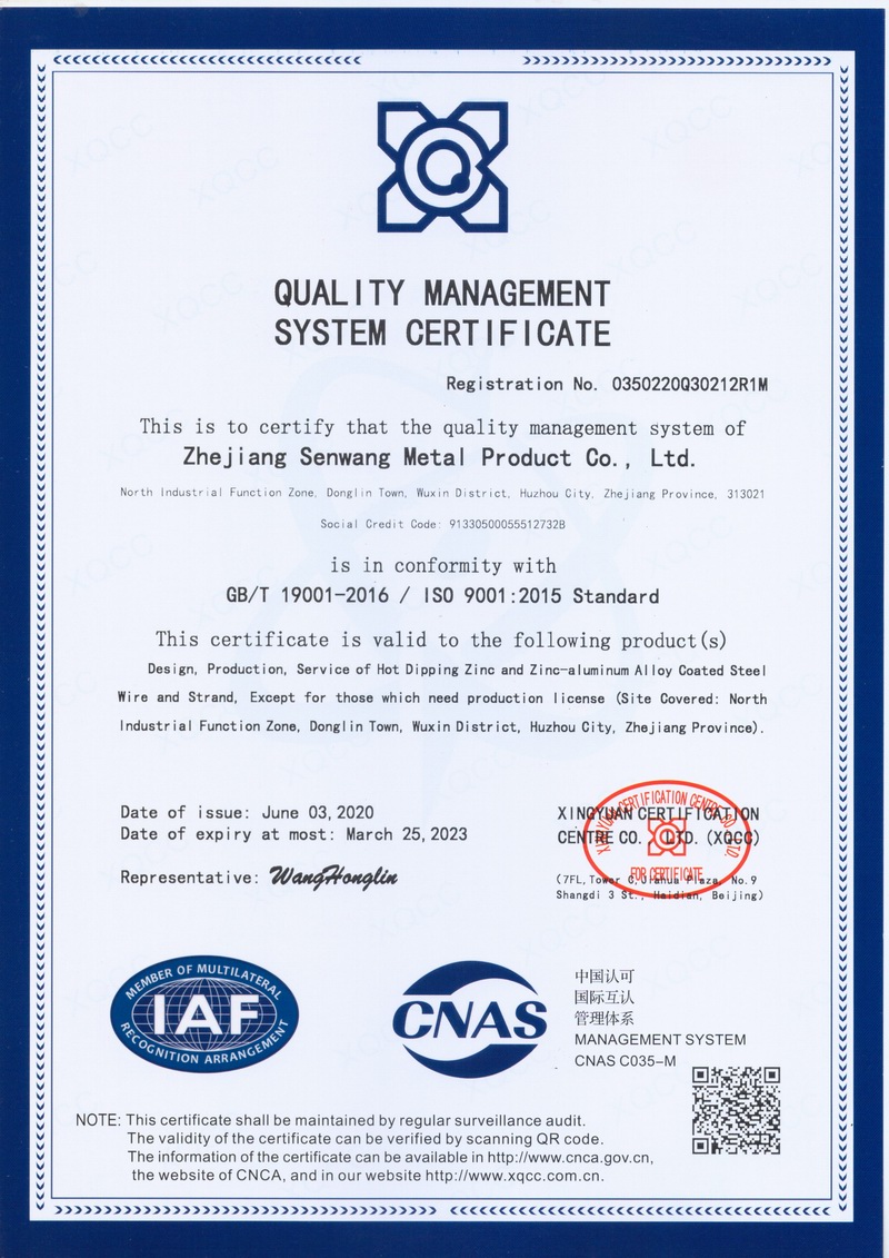 浙江森旺金屬制品有限公司成立于2012年,坐落湖州市吳興區(qū)東林鎮(zhèn)工業(yè)功能區(qū)。公司專業(yè)從事各類鍍鋅鋼絲、鋼絞線等產(chǎn)品的開(kāi)發(fā)及生產(chǎn)。目前產(chǎn)品已廣泛應(yīng)用于各類通信光電纜,電力輸送,電氣化鐵路工程,各類堤壩防護(hù)及農(nóng)業(yè)溫室等工程領(lǐng)域。公司秉承“追求卓越品質(zhì),創(chuàng)建卓著信譽(yù)”的經(jīng)營(yíng)理念,始終堅(jiān)持專業(yè)化、規(guī)模化的經(jīng)營(yíng)模式。